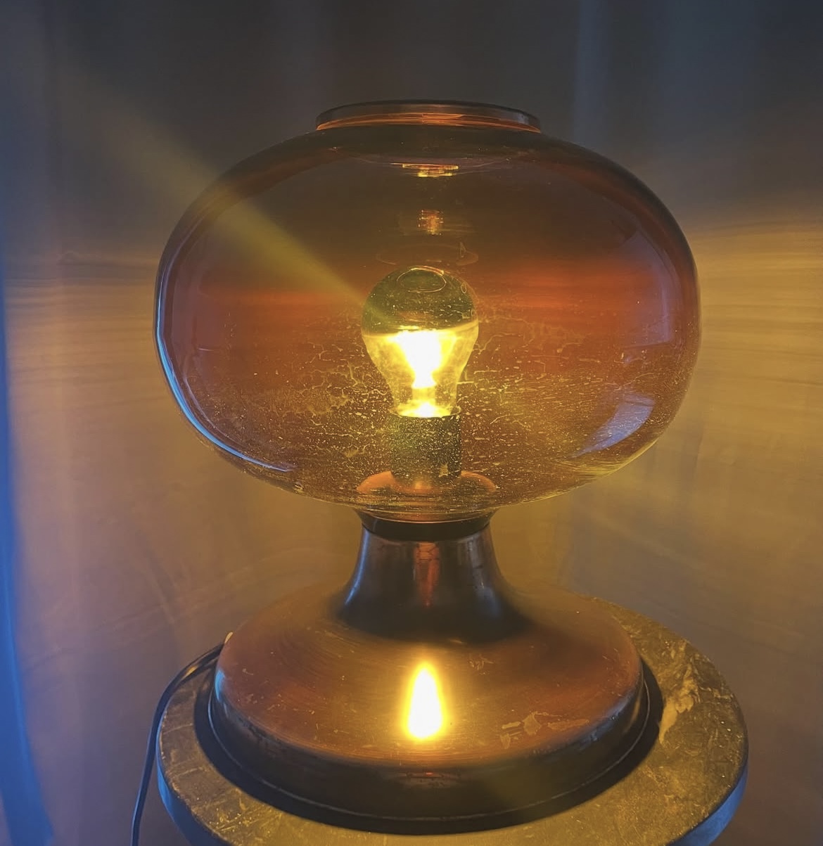 Ez a különleges lámpa a vörösréz test és a borostyánszínű üveg titokzatos találkozásából született. Olyan, mintha egy ’70-es évekbeli űrkorszaki szobor lenne, amely egy belsőépítész asztalán landolt, és most új otthonra vár.
